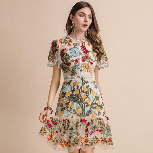 LD LINDA DELLA New 2023 Fashion Runway Summer Dress Women's Flare Sleeve Floral Embroidery Elegant Mesh Hollow Out Midi Dresses